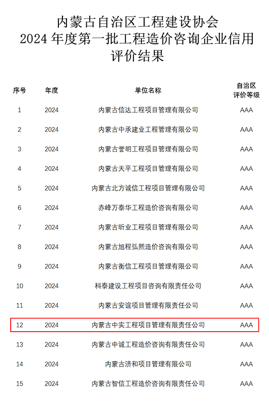 2024-07-3015281 次近期,我公司參加內(nèi)蒙古自治區(qū)工程建設(shè)協(xié)會(huì)組織的“2024年度第一批工程造價(jià)咨詢企業(yè)信用”申報(bào),獲得“信用AAA級(jí)證書”。我公司成立多年以來(lái),遵循中國(guó)工程造價(jià)管理協(xié)會(huì)對(duì)造價(jià)咨詢企…